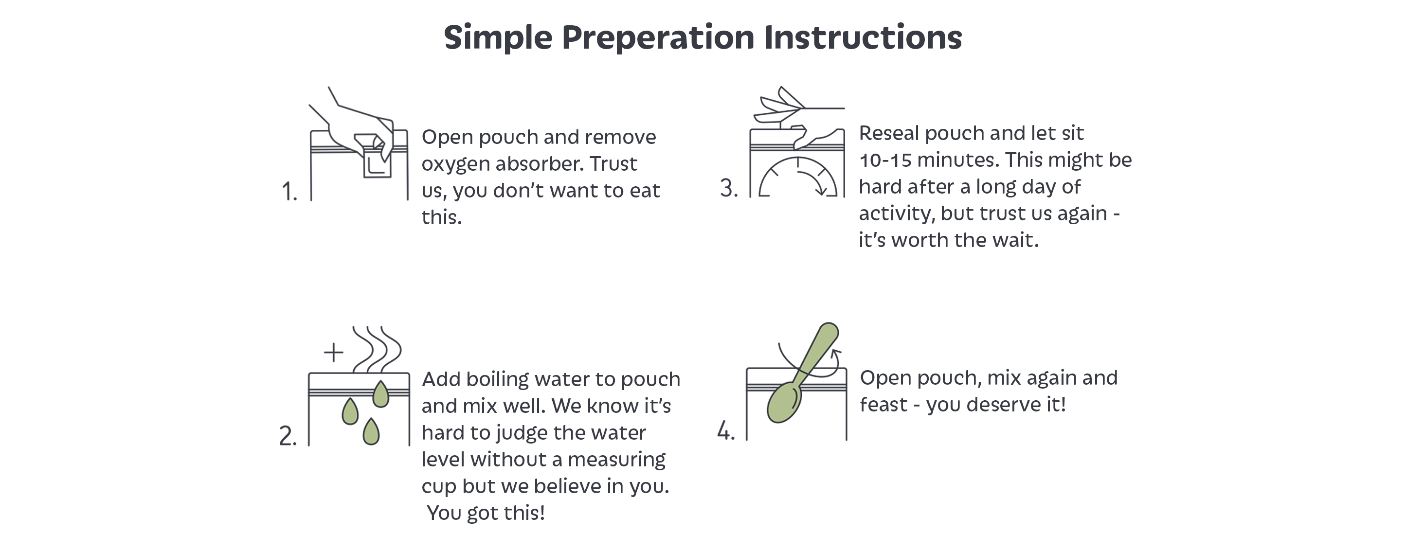All Fuel Your Feat meals are pre-cooked and ready to go, all that's required is some added water! Meals can be made with hot or cold water, but whichever one you choose will effect how long the meals take to rehydrate. In addition, your elevation plays a role in rehydration times.